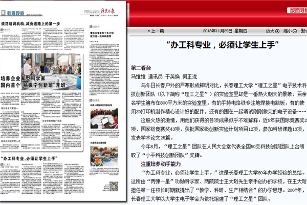 11月29日,《科技日报》教育观察版刊发了由我校党委宣传部部长、新闻中心主任于英焕,工作人员何正泷共同采写的题为《办工科专业,必须让学生上手》的稿件,详细报道了我校在工科人才培养和大学生科技创新方面取得的宝贵经验和丰硕成果。人民网、中国经济网等网络主流媒体纷纷转发该报道。