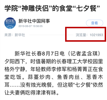 对此,新华社以 “学院“神雕侠侣”的食堂“七夕餐””为题进行独家报道,讲述了我校计算机科学技术学院青年教师李修军和妻子杨菁菁在紧张工作中度过的一个特别的“七夕”。截至发稿前,新华社客户端点击量已经超过百万。