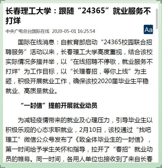 5月1日,中央广电总台国际在线频道以“MK平台:跟随‘24365’ ,就业服务不打烊”为题,从“一封信”提前开展就业动员、“一平台”实现在线全程就业、“一对一”提供精准就业帮扶、“一推广”鼓励学生留省就业四个方面,对我校在新冠肺炎疫情防控期间开展精细化就业服务工作进行了详细报道。