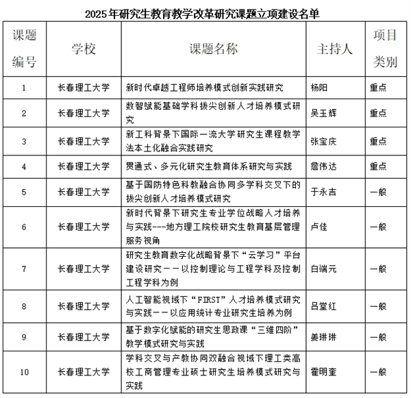 近日,吉林省教育厅公布了第四批省级研究生精品示范课程、专业学位研究生教学案例和2025年研究生教育教学改革研究课题立项建设名单。我校获批研究生精品示范课程立项建设项目4项、教学案例立项建设项目4项、研究生教育教学改革研究课题建设项目10项。