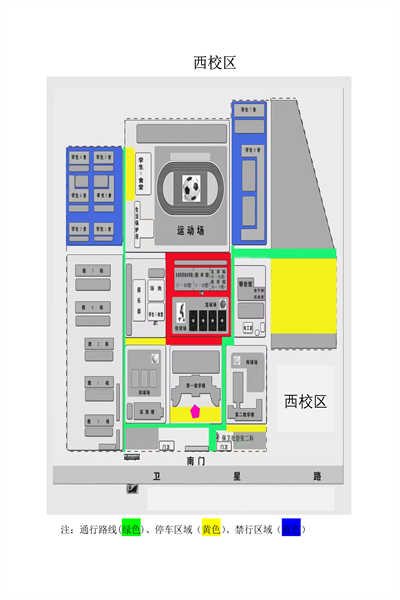 4.西校区两个学生宿舍区域实行交通管制。正门、西门均可双向通行,社会车辆有序停放于各停车场;原铁塔厂院内作为临时停车场,东门车辆通道作为出口单向通行。