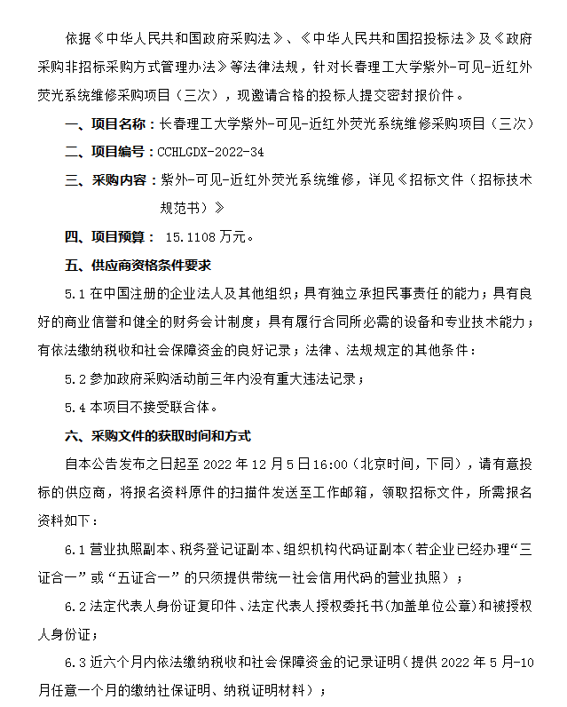 MK平台紫外-可见-近红外荧光系统维修采购项目(三次)竞争性谈判公告