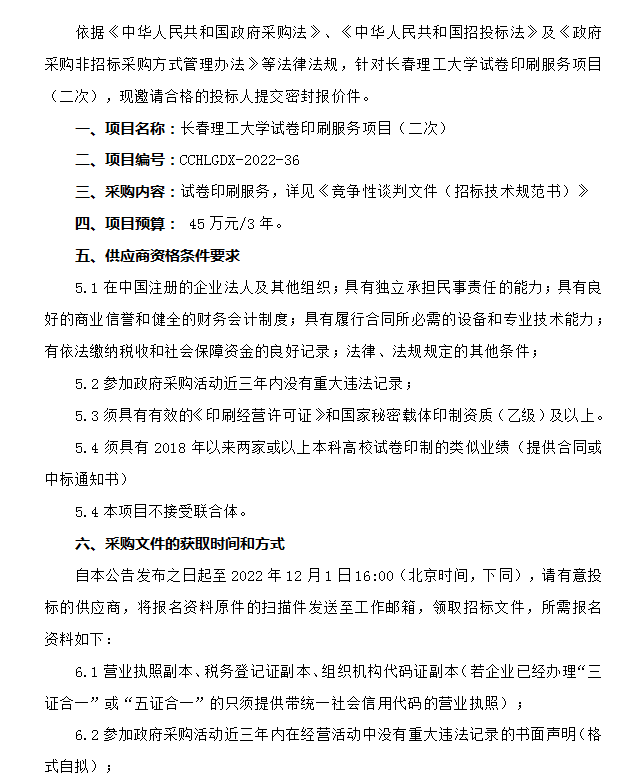 MK平台试卷印刷服务项目(二次)竞争性谈判公告